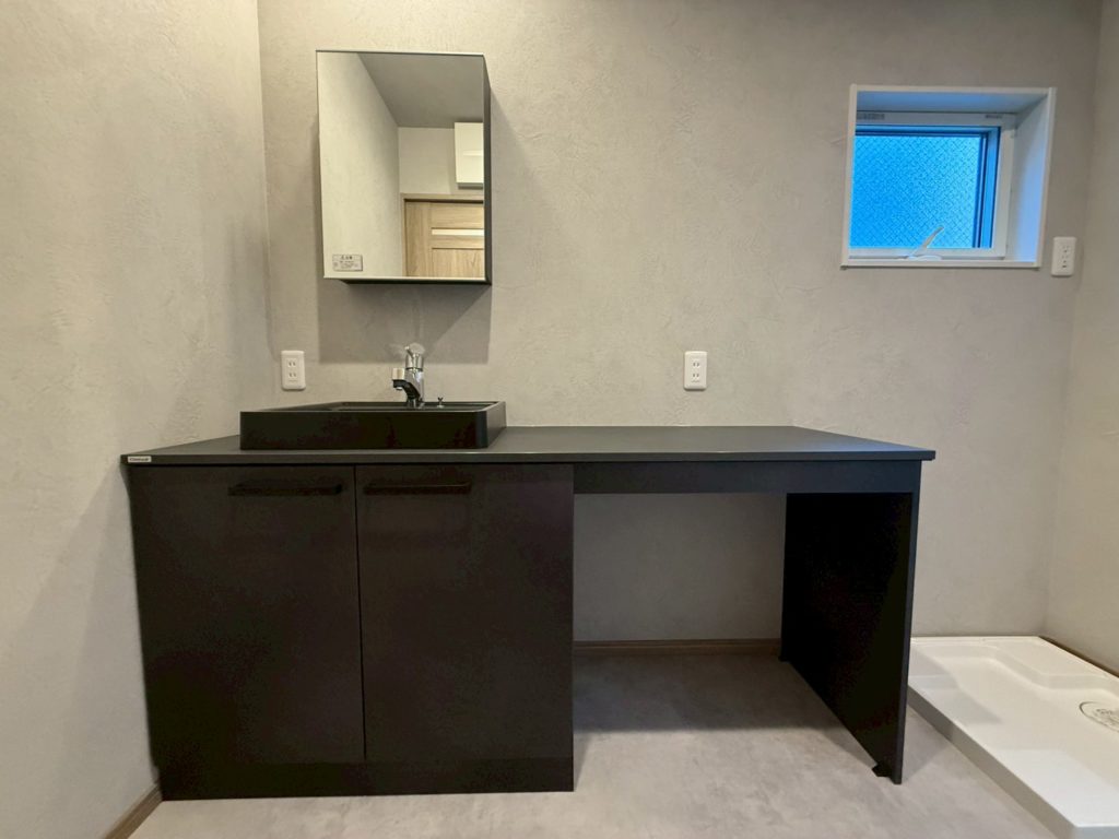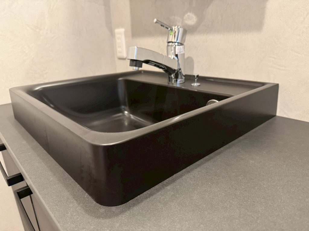 洗面台にはこだわり抜いたブラックを採用し、モダンで引き締まった印象に。