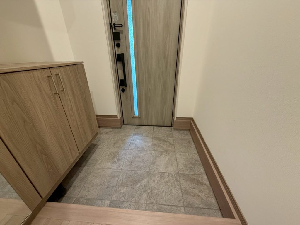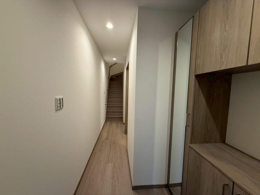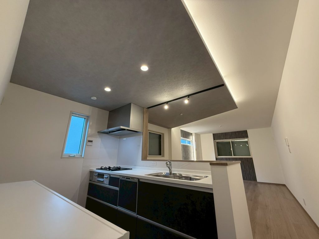 折り上げ天井が生む奥行きと陰影が、空間に豊かな表情を与えます。埋め込み照明のやわらかな光が、静かに、上品に、暮らしを照らす。シックでモダンな住まいの中に、“自分らしさ”が息づく一邸です。